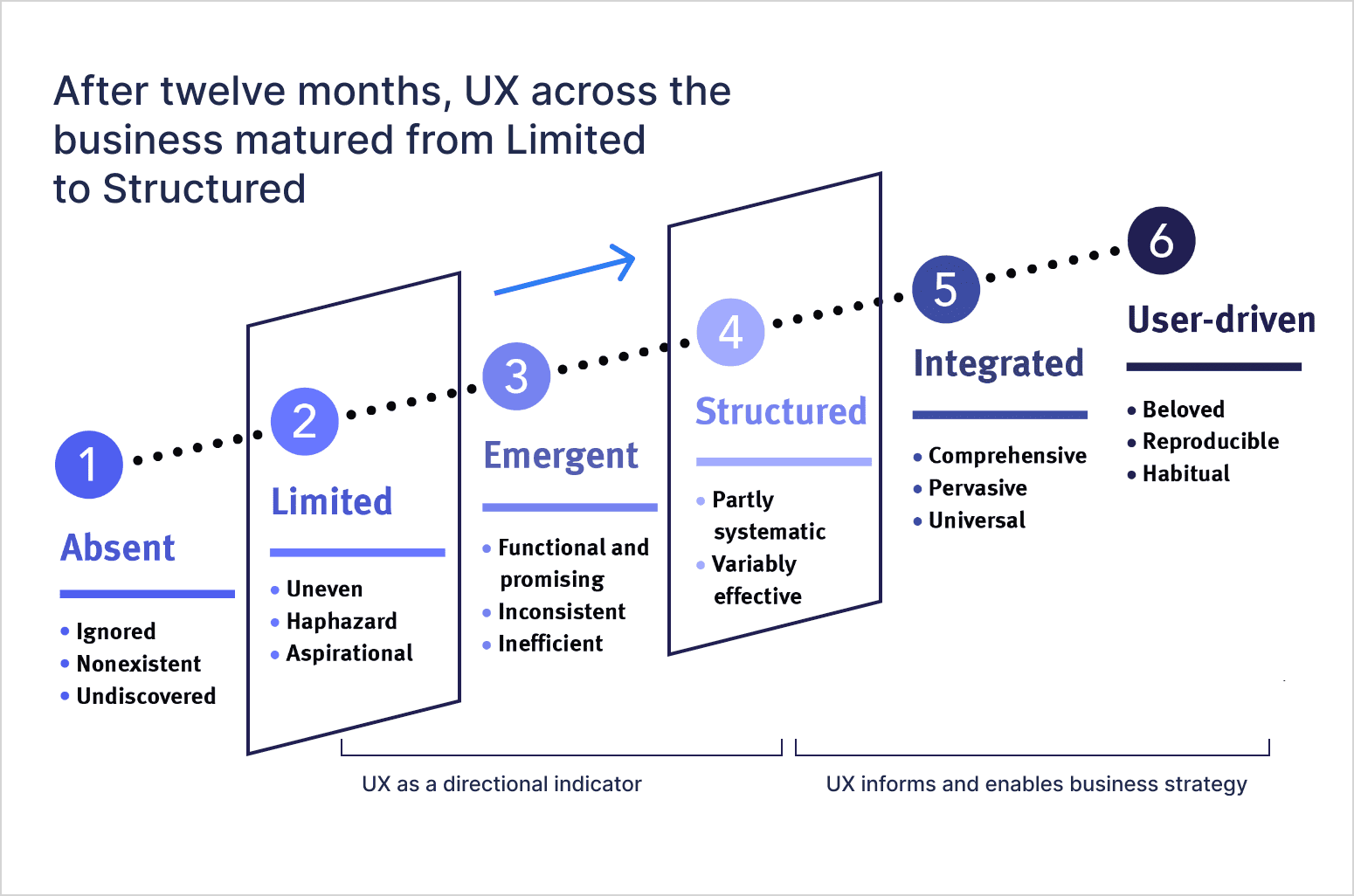 A variation on the NNM Group UX maturity model, the data consistently pointed towards #2 – Limited UX maturity, where there’s a growing awareness of UX and a desire to improve it, but with inconsistent processes and practices.